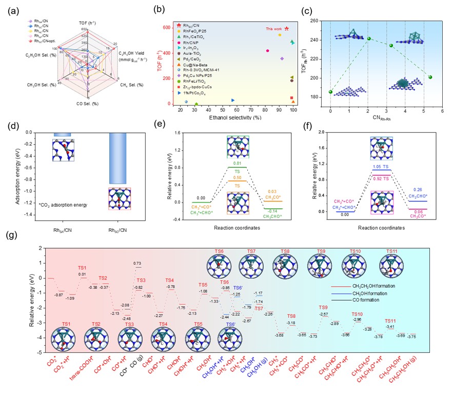 近期,研究團隊創(chuàng)制了具有單團簇結(jié)構(gòu)的RhSC/CN催化劑,克服了納米顆粒催化劑上活性金屬原子利用率較低以及單原子催化劑上反應(yīng)效率不高等問題,有效提升了CO2加氫制乙醇的選擇性和乙醇產(chǎn)率。研究發(fā)現(xiàn),該催化劑上活性金屬主要以單團簇形式存在,具有近原子級分散度和對反應(yīng)物分子較強的吸附活化能力。反應(yīng)條件經(jīng)過優(yōu)化后,該催化劑上展現(xiàn)出了最高的乙醇選擇性和乙醇產(chǎn)率,分別為95.3%和17.5 mmol/gcat/h,其上轉(zhuǎn)換頻率TOF值高達595.2 h?1。原位紅外表征證實,該催化劑上特有的單團簇結(jié)構(gòu)能有效促進碳碳偶聯(lián)反應(yīng)和關(guān)鍵中間體生成。理論計算闡明了催化劑單團簇活性位上CH3*和CO*反應(yīng)中間體進行碳碳偶聯(lián)具有最低的反應(yīng)能壘,并揭示了乙醇生成的最優(yōu)反應(yīng)路徑。該工作為同時促進CO2轉(zhuǎn)化和乙醇選擇性生成的單團簇催化劑的設(shè)計提供了新的見解,為實現(xiàn)高效CO2加氫制綠色乙醇提供了一條有應(yīng)用前景的途徑。