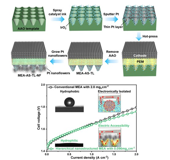 近期,中國科學(xué)院上海高等研究院綠色氫能與高效儲能研究團隊提出“錐狀陣列+超薄Pt層+Pt納米花”的多層級結(jié)構(gòu)設(shè)計理念,通過納米壓印光刻、離子濺射和原位生長三步工藝精準構(gòu)建,同時解決傳統(tǒng)MEA導(dǎo)電性和傳質(zhì)受限兩大核心痛點。超薄Pt層兼具雙重功能:既能使面內(nèi)導(dǎo)電性提升12.3倍,又作為成核位點誘導(dǎo)Pt納米花生長,實現(xiàn)結(jié)構(gòu)與性能的協(xié)同優(yōu)化,進而實現(xiàn)超低Ir負載(0.096 mg cm?2)下的高性能,較傳統(tǒng)MEA節(jié)省95%以上Ir,且在2.0 A cm?2下槽壓(1.758 V)優(yōu)于高Ir負載的傳統(tǒng)MEA(1.797 V@ 2 mg cm-2),為PEMWE的低Ir化應(yīng)用提供了新思路。