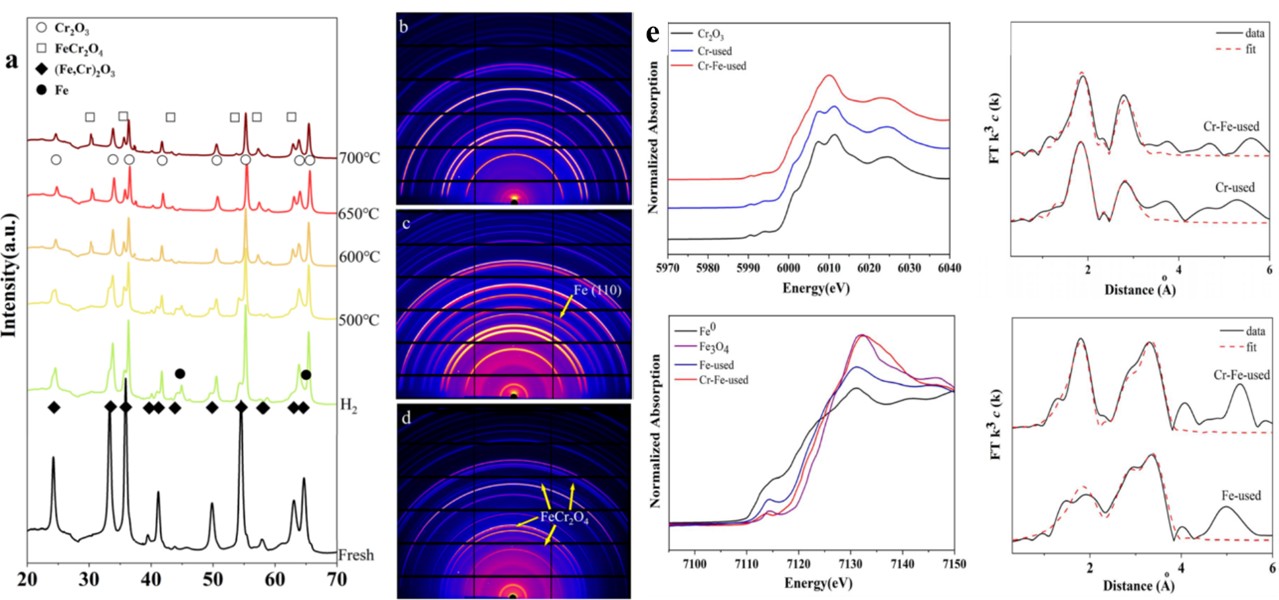圖1.(a-d)Cr-Fe樣品的同步輻射原位XRD與(e)反應(yīng)后不同樣品的X射線吸收譜.