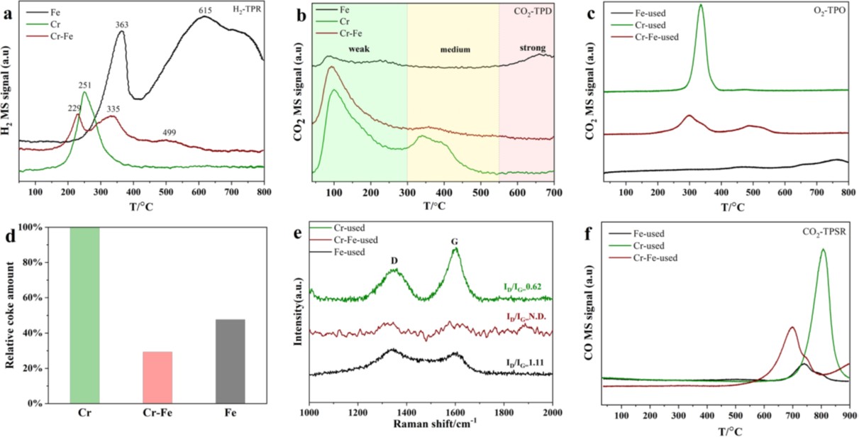 圖2.FeCrOx催化劑樣品的(a)H?-TPR和(b)CO?-TPD圖譜,反應(yīng)后樣品的(c) O2-TPO ,(e)Raman,和(f) CO2-TPSR, 以及(d)根據(jù)(c)圖估算的催化劑相對積碳量.
