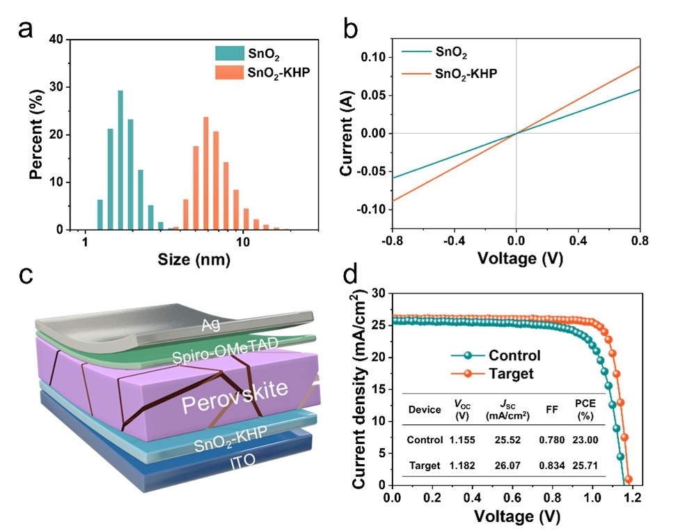 圖1 (a) SnO2和SnO2- KHP膠體的DLS圖;(b) ITO/SnO2和SnO2- KHP /Ag結(jié)構(gòu)器件的暗態(tài)I-V特性曲線;(c-d)鈣鈦礦太陽(yáng)能電池效率圖。