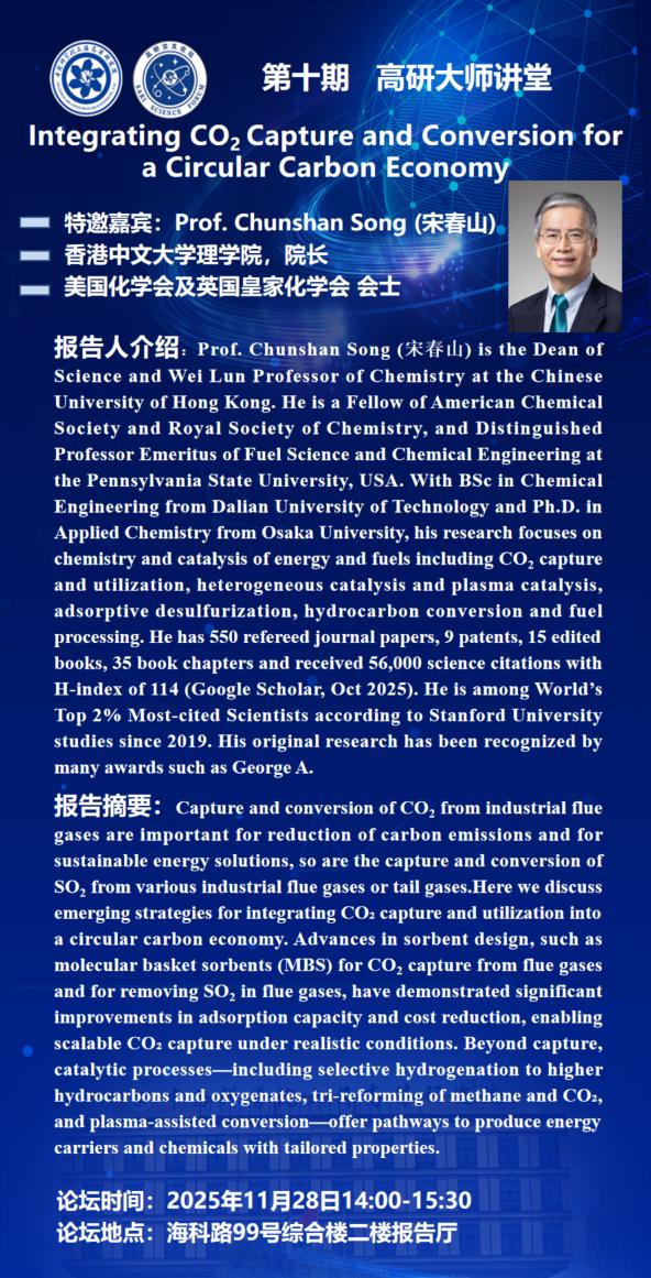 2025年11月28日下午,第十期“高研大師講堂”將在上海高研院召開(kāi),本次論壇以“Integrating CO2 Capture and Conversion for a Circular Carbon Economy”為題,邀請(qǐng)到香港中文大學(xué)理學(xué)院院長(zhǎng),美國(guó)化學(xué)會(huì)及英國(guó)皇家化學(xué)會(huì)會(huì)士,美國(guó)賓夕法尼亞州立大學(xué)燃料科學(xué)與化學(xué)工程名譽(yù)教授宋春山擔(dān)任主講嘉賓,誠(chéng)邀高研院院內(nèi)外科研人員及研究生參加。