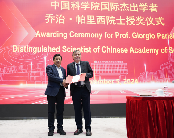 黃政仁在致辭中代表高研院歡迎帕里西院士來訪。他表示,中國科學(xué)院國際杰出學(xué)者計劃旨在鼓勵科技領(lǐng)域取得卓越成就的外國杰出專家訪華開展學(xué)術(shù)交流活動,期待帕里西院士帶來寶貴的學(xué)術(shù)財富和啟示靈感,進(jìn)一步推動上海高研院交叉科學(xué)領(lǐng)域的科研創(chuàng)新發(fā)展。隨后,黃政仁為帕里西院士頒發(fā)中國科學(xué)院國際杰出學(xué)者證書。
