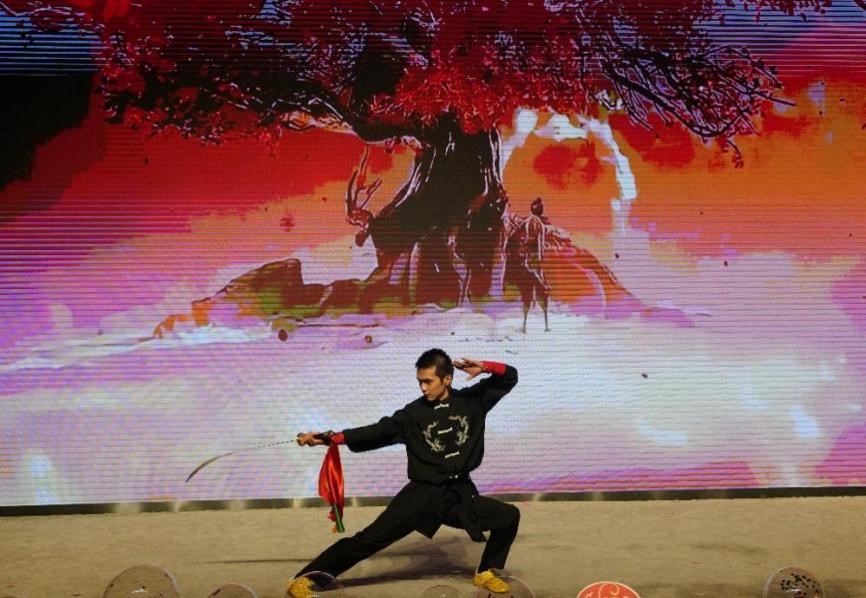 “中華武術(shù),源遠(yuǎn)流長,博大精深,威震四方?!备哐性簭埦盘焱瑢W(xué)帶來的武術(shù)表演《天下》, 于刀光劍影間,盡顯英雄本色;在拳腳舞動時(shí),展露豪邁氣魄,他以精湛武藝贏得了全場喝彩與掌聲。